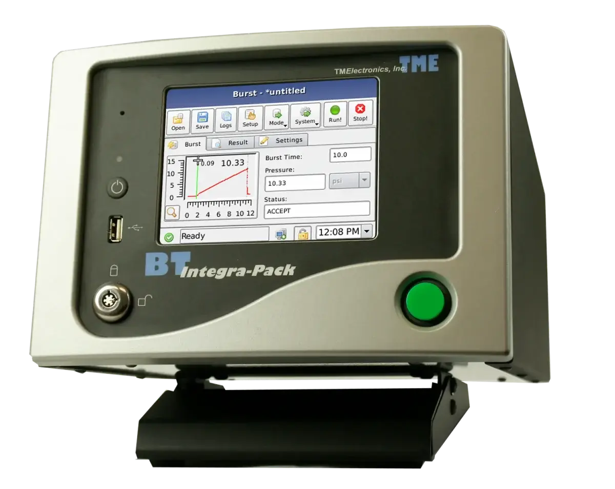 Instrumento de banco para pruebas de empaques, ideal para ensayos de burst, creep y fugas, con alta resolución y operación amigable.